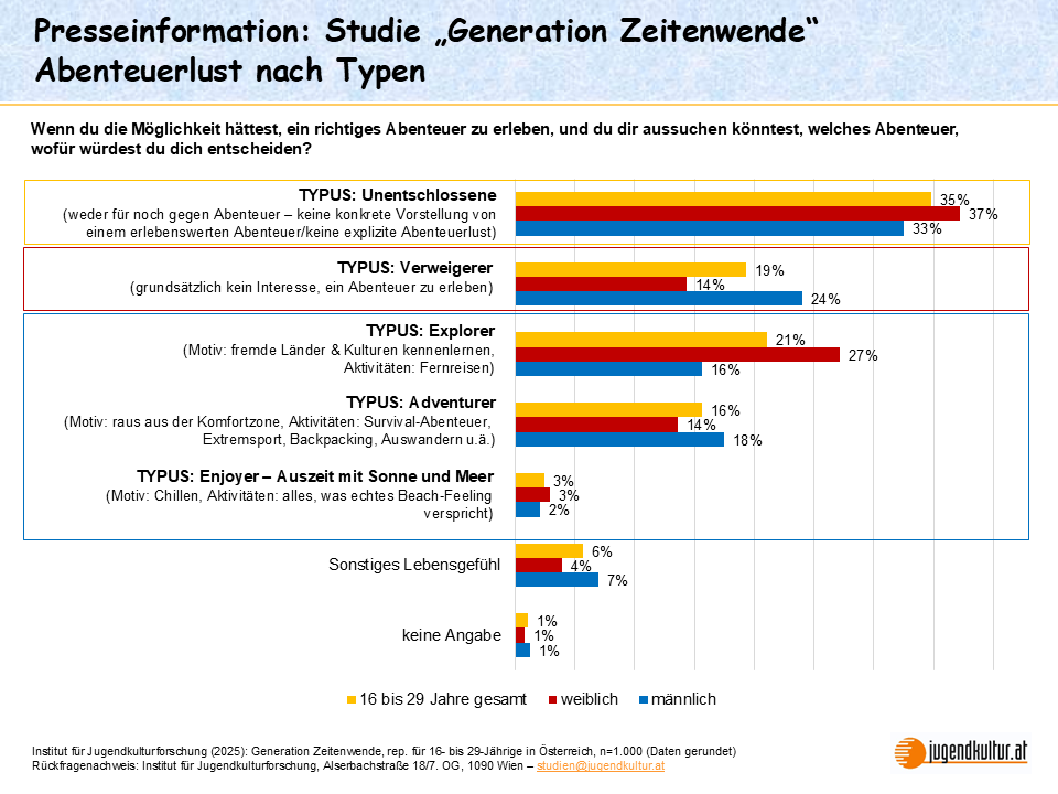 Junge Männer zeigen weniger Abenteuerlust als junge Frauen Das Klischee der experimentierfreudig-abenteuerlustigen Jugend bröckelt. Rund ein Fünftel (19%) der 16- bis 29-Jährigen sagt: „Abenteuer interessieren mich grundsätzlich nicht, ich bin kein abenteuerlustiger Typ“. Weitere 35% haben keine konkrete Vorstellung davon, was sie gerne erleben würden, wenn sie die Möglichkeit zu einem richtigen Abenteuer hätten und sie sich aussuchen könnten, welches Abenteuer dies wäre. Burschen und junge Männer zeigen wider Erwarten noch weniger Erlebnishunger als Mädchen und junge Frauen: Jeder vierte männliche Jugendliche und junge Erwachsene (24%) gibt an, an Abenteuern grundsätzlich nicht interessiert zu sein. Bei den Mädchen und jungen Frauen beschreibt sich jede Siebente (14%) als ein „nicht abenteuerlustiger Typ“. Grenzen ausloten ist für die Erlebniskulturen der heutigen Jugend nicht (mehr) zentral „Abenteuer bedeutet immer auch, sich auf das Unvorhersehbare einzulassen und flexibel, spontan und eigenverantwortlich darauf zu reagieren, was passiert. Und genau das widerspricht dem Bedürfnis der Generation Zeitenwende nach Sicherheit, Planbarkeit und Kontinuität“, erklärt Studienautorin Dr. Beate Großegger. „Die Distanz der heutigen Jugend gegenüber dem Unvorhersehbaren, Ungeplanten und Unbekannten wird in der Abenteuertypologie unserer aktuellen Studie sehr deutlich.“ - 35% der 16- bis 29-jährigen Jugendlichen und jungen Erwachsenen zählen zum Typus der „Unentschlossenen“, d.h. sie sind weder für noch gegen Abenteuer, zeigen keine explizite Abenteuerlust und haben sich auch noch nie Gedanken darüber gemacht, welches Abenteuer sie gerne einmal erleben würden.