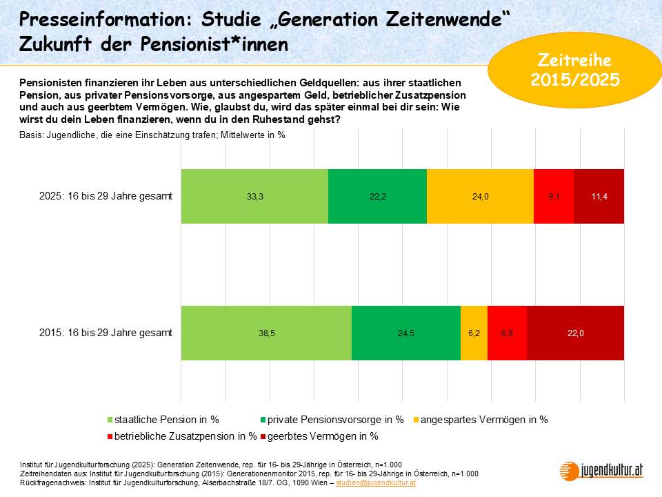 Presseaussendung – Wien, 21.10.2025Keine Lust auf Abenteuer, lieber Sparen für den Ruhestand: Neue Studie zeigt Lebensgefühl Jugendlicher in Zeiten des WirtschaftsabschwungsDie Zeichen stehen auf Veränderung: in Politik und Gesellschaft, im Bereich digitaler Technologien und auch, was den modernen Wohlfahrtsstaat betrifft. Wie erleben junge Menschen diesen Umbruch? Spiegeln sich die zu beobachtenden Wendepunktdynamiken im Lebensgefühl junger Menschen wider und, wenn ja, wie? Dazu hat das Institut für Jugendkulturforschung in der repräsentativen Jugendumfrage „Generation Zeitenwende“ 1.000 junge Menschen im Alter von 16 bis 29 Jahren befragt. Die Studie zeigt: Junge Menschen reagieren mit einem verstärkten Sicherheitsbedürfnis auf die Verwerfungen unserer Zeit. Die Abenteuerlust schwindet. Die Komfortzone steht im Freizeitgeschehen wie auch in den Auszeitphilosophien junger Menschen im Mittelpunkt. Vor dem Hintergrund der aktuellen Pensionsdebatte setzt die Generation Zeitenwende auf Sparen für den Ruhestand. Staatliche Pension im Vertrauenstief, daher gilt: Sparen für den Ruhestand Die Debatte über die Sicherung der Pensionen für kommende Generationen verunsichert. 16- bis 29-Jährige gehen davon aus, dass sie ihre Lebenshaltungskosten im Ruhestand nur mehr zu einem Drittel (33%) aus der staatlichen Pension decken können. Betriebliche Zusatzpensionen spielen aus Sicht der heutigen Jugend zur Deckung der Lebenshaltungskosten im Ruhestand zukünftig kaum eine Rolle. Selbst vorzusorgen, ist demnach angesagt. Die Generation Zeitenwende setzt auf Sparen für den Ruhestand: - 16- bis 29-Jährige stellen sich darauf ein, dass sie, wenn sie in ferner Zukunft in den Ruhestand treten, ihren Lebensunterhalt zu einem Viertel (24%) aus angespartem Vermögen bestreiten werden.