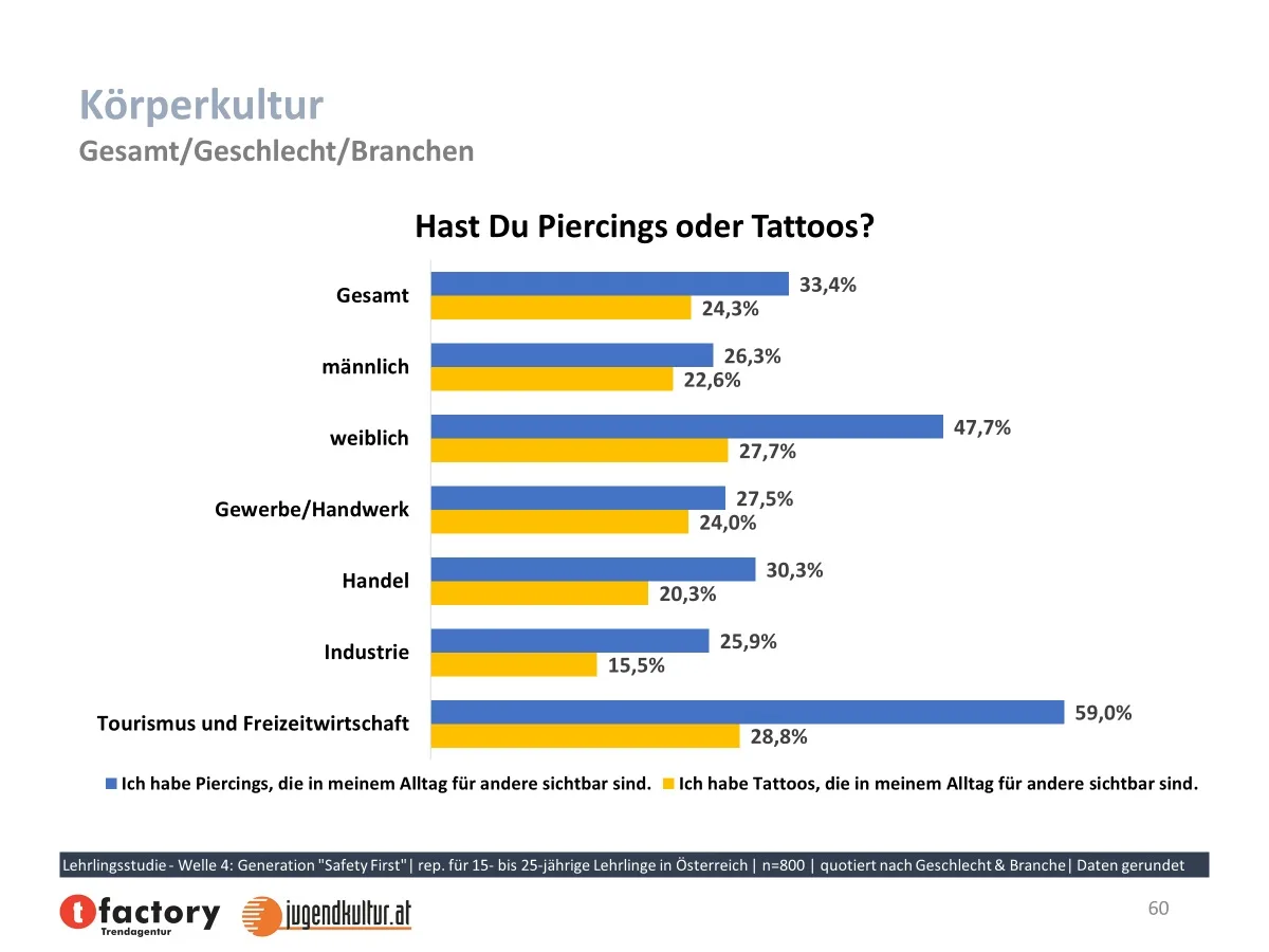 Ab sofort verfügbar: LEHRLINGSSTUDIE 2024DER LEHRBETRIEB ALS FAMILIENERSATZ und DER TÄTOWIERTE LEHRLING: Lesen Sie hier eine Kurzinfo mit exklusiven Ergebnissen unserer neuen repräsentativen Umfrage unter 800 Lehrlingen in Österreich. Für Studienbestellung und Referentenbuchungen kontaktieren Sie bitte Evelyn Nozsicska: enozsicska@jugendkultur.at DIE LEHRLINGE SUCHEN SICHERHEIT, GEBORGENHEIT UND VERSTÄNDNISSeit dem Jahr 2018, als die zweite Welle der österreichischen Lehrlingsstudie durchgeführt wurde, hat sich vieles verändert. Wurde damals die Lehre noch überwiegend als Mittel zur Selbstentfaltung gesehen – man dachte über „Zukunftschancen“ nach, wollte „Verantwortung übernehmen“ und sich mit Hilfe der Lehre „selbstverwirklichen“ – so geht es heute primär um die persönliche „Selbsterhaltung“. Das heißt, dass für die Mehrheit der Lehrlinge die Lehre mehr Stabilität und Sicherheit ins Leben bringen soll. Sicherheit des Arbeitsplatzes, sicheres Einkommen, verlässliche und kompetente Ausbildner, gutes Betriebsklima und gute Arbeitsbedingungen haben für den sicherheitsorientierten jungen Menschen heute Priorität. Stand die Sicherheit noch 2018 lediglich auf Platz zehn der Anforderungen an die Lehre, so ist sie heute an der Spitze der Rangreihe zu finden: Grafik Image-Profil der Lehre downloaden Und weil die bürgerliche Familie offenbar keine emotionale Heimat mehr wie früher ist, sondern eher eine kühle Interessensgemeinschaft, suchen viele Jugendliche nun Verständnis und Geborgenheit im Ausbildungsbetrieb. Vor allem die Ausbildner und die Lehrbeauftragten sind dann gefordert, weil von ihnen vieles von dem erwartet wird, was früher die Eltern für die Jugendlichen geleistet haben. Die Lehrlinge wollen im Lehrbetrieb heute als „ganzer Mensch“ wahrgenommen werden und nicht nur als Arbeitskraft. Auch persönliche Probleme sollen im Betrieb besprochen werden können. Viele Ausbildungsbetriebe überlegen deshalb, den Lehrlingsausbildern Zusatzqualifikationen zu den Themen Konfliktmanagement und Entwicklungspsychologie anzubieten. LEHRLINGE SIND KÖRPERWESEN55% der österreichischen Lehrlinge treiben mehrmals die Woche Sport, bei den jungen Männern sind es sogar zwei Drittel, bei den jungen Frauen 40%. Ein durchtrainierter Körper spielt für 70% der Befragten im Leben eine wichtige Rolle, über 50% würden für einen gutaussehenden Körper sogar gesundheitliche Risiken in Kauf nehmen, die zum Beispiel durch die Einnahme von Muskelaufbaupräparaten entstehen könnten. Bodystylen spielt eine große Rolle und in diesem Zusammenhang ist auch das Thema Piercing und Tattoo mehr denn je relevant geworden. Fast 60% der befragten 800 Lehrlinge meinen, dass Piercings und Tattoos den Menschen attraktiver machen und 46% meinen, dass man mit ihnen „rebellisch“ wirkt. Wenn man sich schon anpassen muss, um ein wenig mehr an Sicherheit zu bekommen, dann will man wenigstens ein rebellisches Styling haben. Früher waren Piercings und Tattoos in Lehrbetrieben häufig ein „Casus Belli“. Heute muss man sich wohl damit abfinden, denn 33% der Befragten sind gepierct, 24% haben ein Tattoo. Bei den Frauen und bei den Lehrlingen im Tourismus ist der Anteil der „Körpergeschmückten“ besonders hoch. Und fast 50% der Befragten haben vor, sich demnächst Tattoos stechen zu lassen. Deshalb wird es notwendig sein, in Zukunft unaufgeregt mit dem Hautschmuck umzugehen und einen für beide Seiten vernünftigen Modus Operandi zu finden: Grafik Körperkultur downloaden DIESE UND VIELE WEITERE INTERESSANTE UND WERTVOLLE ERGEBNISSE FINDEN SIE IM STUDIENBAND DER ERSTEN ÖSTERREICHISCHEN LEHRLINGSSTUDIE 2024 – WELLE 4:- Ab heute ist die Studie verfügbar – bestellen Sie jetzt das Studienpaket um € 2.690,- und Sie erhalten Tabellenband, Chartsband, Textband und eine ausführliche Studienpräsentation inkl. Diskussion und Beratung (Termin n.V.).