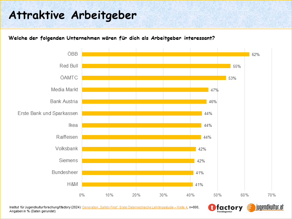 Exklusiv für unsere Newsletter-AbonnentInnenExklusiv für unsere Newsletter-AbonnentInnen haben wir aus der breiten Fülle der top-aktuellen Studienergebnisse eine kleine Auswahl getroffen, die wir Ihnen hier präsentieren. Der Ausbildungsbetrieb ist in Krisenzeiten ein Fels in der Brandung In Zeiten der Krise denkt die Jugend in erster Linie über Sicherheit nach. Risiko und Abenteuer sind nicht angesagt. Man will klare Verhältnisse und eine materiell solide Lebensgrundlage. Vor allem die Teuerung und die Kriegsstimmung in Europa machen der neuen Lehrlingsgeneration zu schaffen. Um sich sicherer zu fühlen, orientiert man sich lange an den Eltern und sucht nach einem Ausbildungsbetrieb, der stabil, beständig und widerstandsfähig erscheint. Der Ausbildungsbetrieb soll neben dem Elternhaus der zweite Fels in der Brandung des Lebens sein. Aber nicht alle Lehrlinge sind gleich. Abhängig von der Sparte, in der sie arbeiten, unterscheiden sie sich. Besonders die Lehrlinge in der Tourismusbranche heben sich stark vom Mainstream ab – sie erscheinen als Zugvögel und Abenteurer. Bevor sie eine Familie gründen, wollen sie ordentlich etwas erleben. Aber auch die Lehrlinge aus Industrie, Handwerk/Gewerbe und dem Handel haben ihre Besonderheiten. Die Studie Generation „Safety First“ zeigt distinkte Typen, für die sich wichtige Handlungsanleitungen im Umgang mit Lehrlingen wie auch im Hinblick auf die werbliche Kommunikation ableiten lassen. Der ideale Ausbildungsbetrieb Lehrlinge machen sich viele Gedanken über ihren zukünftigen Lehrbetrieb. Wie muss dieser beschaffen sein, damit man sich ihm zuwendet? In Krisenzeiten steht als wichtigstes Kriterium die Arbeitsplatzsicherheit im Mittelpunkt. Danach folgen eine angenehme Arbeitszeit und eine hohe Lehrlingsentschädigung. Frauen sind besonders sicherheitsorientiert und haben ein großes Bedürfnis, die Arbeitszeit mitzugestalten, um sie gut auf die eigenen Bedürfnisse und Maßgeblichkeiten abstimmen zu können. Am stärksten auf Arbeitsplatzsicherheit ausgerichtet sind Lehrlinge der Sparte „Industrie“, während Lehrlinge der Tourismusbranche besonders großen Wert auf eine hohe Lehrlingsentschädigung legen. Welche Betriebe sind in der Hitliste der Generation „Safety First“ ganz oben? Und welche sind interessant als zukünftige Arbeitgeber? Ganz oben rangiert die ÖBB. Die Marke steht für Sicherheit, Beständigkeit und ArbeitnehmerInnenfreundlichkeit. Im Gegensatz dazu die auf Platz zwei gereihte Marke „Red Bull“. Sie repräsentiert Erfolg, Aufstieg und Innovation. Der an dritter Stelle platzierte ÖAMTC punktet als sicheres und traditionsbewusstes österreichisches Unternehmen, welches für das jungen Menschen wichtige Thema „Mobilität“ steht. Auf den weiteren Plätzen folgen Finanzdienstleister, große Industriebetriebe und internationale Handelskonzerne. Eine Liste der abgefragten Unternehmen erhalten Sie gerne auf Anfrage an: studienleitung@jugendkultur.at Weitere Themen der Studie: - Erwartungen an die betriebliche Lehre