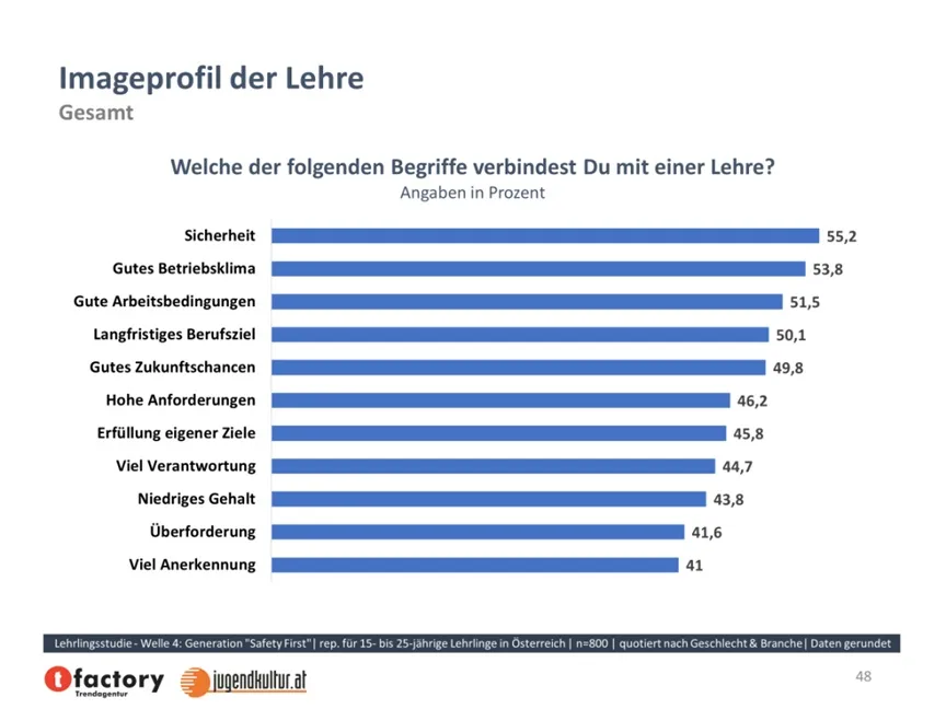 Ab sofort verfügbar: LEHRLINGSSTUDIE 2024DER LEHRBETRIEB ALS FAMILIENERSATZ und DER TÄTOWIERTE LEHRLING: Lesen Sie hier eine Kurzinfo mit exklusiven Ergebnissen unserer neuen repräsentativen Umfrage unter 800 Lehrlingen in Österreich. Für Studienbestellung und Referentenbuchungen kontaktieren Sie bitte Evelyn Nozsicska: enozsicska@jugendkultur.at DIE LEHRLINGE SUCHEN SICHERHEIT, GEBORGENHEIT UND VERSTÄNDNISSeit dem Jahr 2018, als die zweite Welle der österreichischen Lehrlingsstudie durchgeführt wurde, hat sich vieles verändert. Wurde damals die Lehre noch überwiegend als Mittel zur Selbstentfaltung gesehen – man dachte über „Zukunftschancen“ nach, wollte „Verantwortung übernehmen“ und sich mit Hilfe der Lehre „selbstverwirklichen“ – so geht es heute primär um die persönliche „Selbsterhaltung“. Das heißt, dass für die Mehrheit der Lehrlinge die Lehre mehr Stabilität und Sicherheit ins Leben bringen soll. Sicherheit des Arbeitsplatzes, sicheres Einkommen, verlässliche und kompetente Ausbildner, gutes Betriebsklima und gute Arbeitsbedingungen haben für den sicherheitsorientierten jungen Menschen heute Priorität. Stand die Sicherheit noch 2018 lediglich auf Platz zehn der Anforderungen an die Lehre, so ist sie heute an der Spitze der Rangreihe zu finden: Grafik Image-Profil der Lehre downloaden Und weil die bürgerliche Familie offenbar keine emotionale Heimat mehr wie früher ist, sondern eher eine kühle Interessensgemeinschaft, suchen viele Jugendliche nun Verständnis und Geborgenheit im Ausbildungsbetrieb. Vor allem die Ausbildner und die Lehrbeauftragten sind dann gefordert, weil von ihnen vieles von dem erwartet wird, was früher die Eltern für die Jugendlichen geleistet haben. Die Lehrlinge wollen im Lehrbetrieb heute als „ganzer Mensch“ wahrgenommen werden und nicht nur als Arbeitskraft. Auch persönliche Probleme sollen im Betrieb besprochen werden können. Viele Ausbildungsbetriebe überlegen deshalb, den Lehrlingsausbildern Zusatzqualifikationen zu den Themen Konfliktmanagement und Entwicklungspsychologie anzubieten. LEHRLINGE SIND KÖRPERWESEN55% der österreichischen Lehrlinge treiben mehrmals die Woche Sport, bei den jungen Männern sind es sogar zwei Drittel, bei den jungen Frauen 40%. Ein durchtrainierter Körper spielt für 70% der Befragten im Leben eine wichtige Rolle, über 50% würden für einen gutaussehenden Körper sogar gesundheitliche Risiken in Kauf nehmen, die zum Beispiel durch die Einnahme von Muskelaufbaupräparaten entstehen könnten. Bodystylen spielt eine große Rolle und in diesem Zusammenhang ist auch das Thema Piercing und Tattoo mehr denn je relevant geworden. Fast 60% der befragten 800 Lehrlinge meinen, dass Piercings und Tattoos den Menschen attraktiver machen und 46% meinen, dass man mit ihnen „rebellisch“ wirkt. Wenn man sich schon anpassen muss, um ein wenig mehr an Sicherheit zu bekommen, dann will man wenigstens ein rebellisches Styling haben. Früher waren Piercings und Tattoos in Lehrbetrieben häufig ein „Casus Belli“. Heute muss man sich wohl damit abfinden, denn 33% der Befragten sind gepierct, 24% haben ein Tattoo. Bei den Frauen und bei den Lehrlingen im Tourismus ist der Anteil der „Körpergeschmückten“ besonders hoch. Und fast 50% der Befragten haben vor, sich demnächst Tattoos stechen zu lassen. Deshalb wird es notwendig sein, in Zukunft unaufgeregt mit dem Hautschmuck umzugehen und einen für beide Seiten vernünftigen Modus Operandi zu finden: Grafik Körperkultur downloaden DIESE UND VIELE WEITERE INTERESSANTE UND WERTVOLLE ERGEBNISSE FINDEN SIE IM STUDIENBAND DER ERSTEN ÖSTERREICHISCHEN LEHRLINGSSTUDIE 2024 – WELLE 4:- Ab heute ist die Studie verfügbar – bestellen Sie jetzt das Studienpaket um € 2.690,- und Sie erhalten Tabellenband, Chartsband, Textband und eine ausführliche Studienpräsentation inkl. Diskussion und Beratung (Termin n.V.).